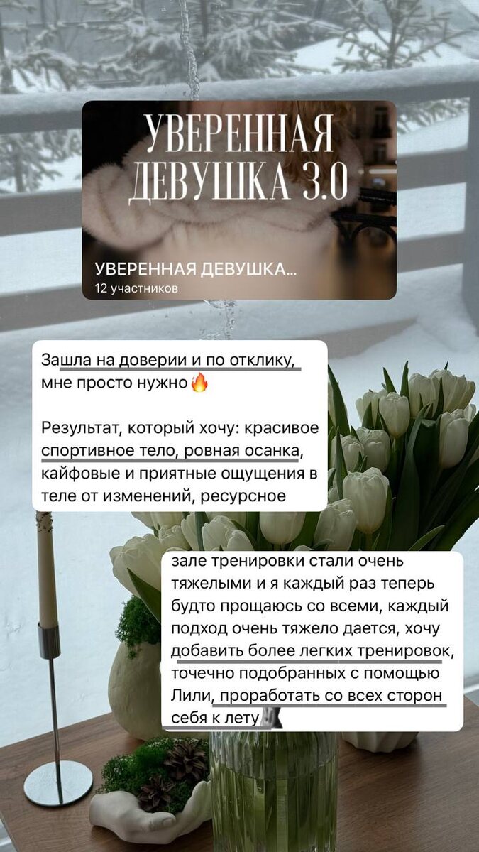 💔 следующий запуск через 2-3 месяца а пока вас ждёт порция сочного контента 🫦 — но вы просто посмотрите, каких заряженных красоток я собрала нас 12 человек и у каждой своя история и цели, но один вектор: «хочу красивое спортивное тело» «хочу добавить более легких тренировок и проработать со всех сторон себя к лету» и вот это, когда возвращаются спустя годы - это для меня самый сильный показатель результата 🔴 потому что у нас не про «похудеть к событию», а про наведение порядка в теле и голове «работала с Лилей 3 года назад и вернулась к своей до беременной форме, но я ленивая жопка» «у Лили уже была, хорошо подтянули фигуру и тем летом я чувствовала себя звездой» 🔡эта неделя вводная: начинаем тренировки, входим в режим, учимся чувствовать тело, готовим мышцы и голову к переменам я почти уверена, что ещё пару дней будут присоединяться новенькие а потом двери закроются 🩷