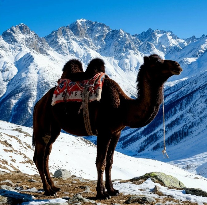 Снег нарастает белой холодной шапкой на поклаже и с шагом осыпается сугробом. Сыплется на глаза, на ноздри, под ноги. Набивается ветром в шерсть и густой подшерсток, затем тает от тепла тела, исходящего изнутри и замерзает коркой сверху. Это мешает движению, хотя подо льдом тепло сохраняется у тела и не дает мерзнуть. Уж лучше лежать в пустыни на горячем песке, закрыв глаза и мечтать о вкусной колючке и водопое с теплой ласкающей водой из источника. А здесь – подъем в гору среди безмолвных сугробов. С питьем правда проблем не возникает. Он научился хватать зубами снег, который затем тает в пасти и становится водой. Таким образом, преодолеваются большие расстояния без остановок на водопой, да и где взять живительную влагу при таких морозах? Черный верблюд привычно схватил пригоршню снега и прижал языком к небу холодный комок.
