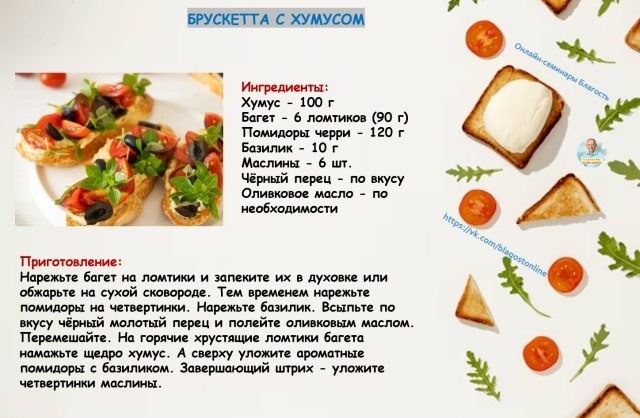 🌀 Ингредиенты: Хумус - 100 г Багет - 6 ломтиков (90 г) Помидоры черри - 120 г Базилик - 10 г Маслины - 6 шт. Чёрный перец - по вкусу Оливковое масло - по необходимости 🌀 Приготовление: Нарежьте багет на ломтики и запеките их в духовке или обжарьте на сухой сковороде. Тем временем нарежьте помидоры на четвертинки. Нарежьте базилик. Всыпьте по вкусу чёрный молотый перец и полейте оливковым маслом. Перемешайте. На горячие хрустящие ломтики багета намажьте щедро хумус. А сверху уложите ароматные помидоры с базиликом. Завершающий штрих - уложите четвертинки маслины.