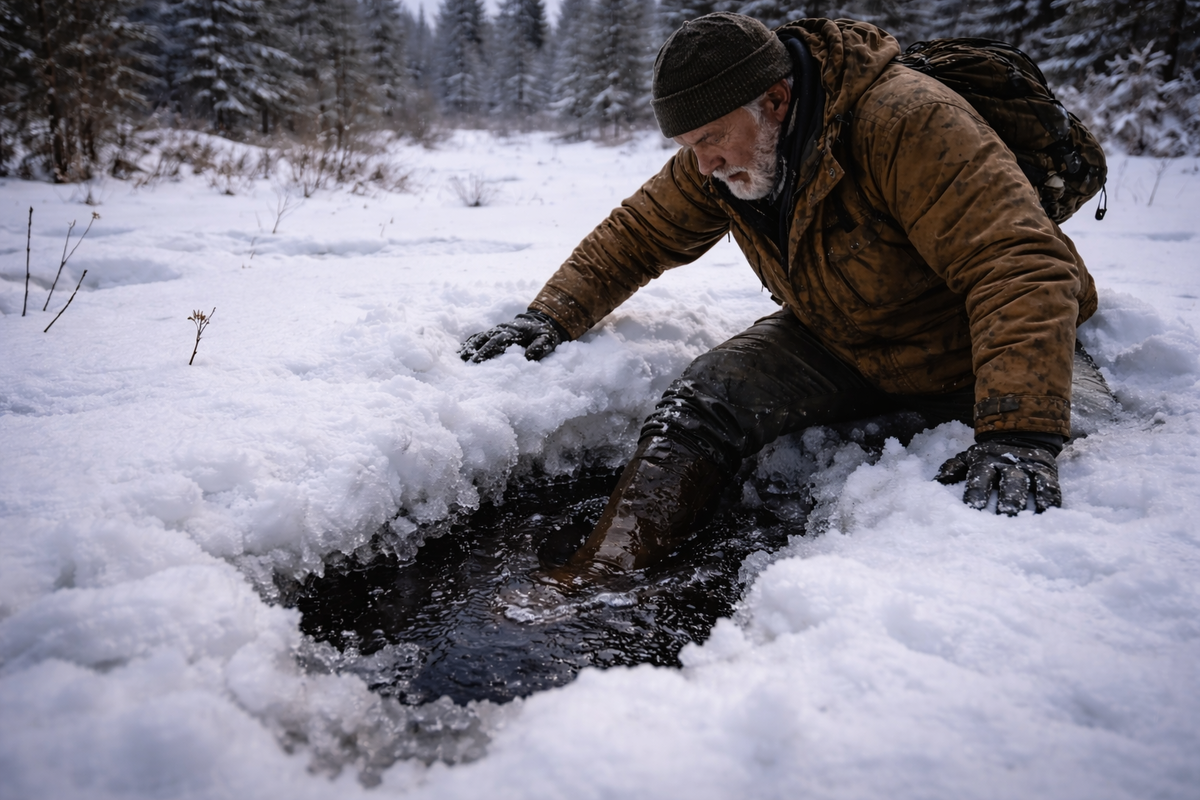 Зима к середине февраля становится обманчиво надёжной. Наст держит, как бетон. Идёшь по болоту, где осенью вяз в грязи, и не проваливаешься ни на сантиметр. Лыжи почти не нужны — поверхность плотная, звонкая. Каждый шаг отдаётся сухим хрустом, и кажется, что сезон устоялся окончательно. Именно в такие дни чаще всего случается ошибка. Я шёл по знакомому маршруту через старое болотце, которое знал много лет. Под ним — торф, коряги, мелкие ключи, но зимой всё это обычно схватывается намертво. Мороз держался больше месяца. Ночами доходило до минус тридцати пяти. Казалось, что промёрзло всё. Солнце стояло низко, воздух был прозрачным, без ветра. Я шёл налегке — проверял дальний участок, без тяжёлого груза. Дистанция до избы — километра три. Первый тревожный знак я не заметил. Под настом иногда слышится глухой звук — будто шаг отдаётся глубже, чем обычно. Но когда идёшь уверенно, такие мелочи игнорируются. Следующий шаг ушёл вниз. Без предупреждения. Нога провалилась по бедро в ледяную пуст
