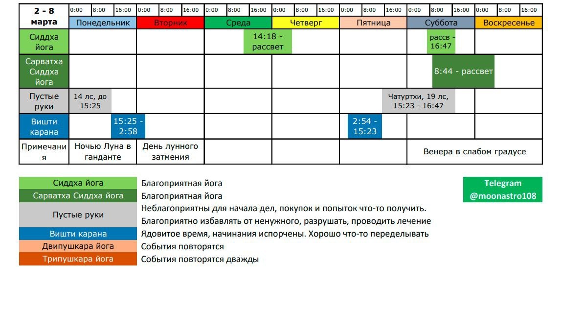Часовой пояс GMT +3 (MSK) 🔸Во вторник лунное затмение, потом будут благоприятные дни 🔸Венера в экзальтации. Творите и делитесь радостью с другими! 🔸Юпитер и Меркурий ретроградные, обе планеты отвечают за знания. Будет непросто друг друга понимать. Уточняйте, переспрашивайте и не раздражайтесь, если вас не понимают с 1-го раза, и даже со 2-го раза. Пока не рекомендуется заключать контракты, начинать обучение и покупать гаджеты. Если вы что-то решите сейчас начать, после 20-го марта можете передумать 🔹Понедельник - подготовка к лунному затмению, атмосфера потихоньку накаляется. Утром Пустые руки, потом ядовитая часть полнолуния. Сегодня важного точно начинать не стоит, но и рутиной будет заниматься непросто, душа потребует масштаба и праздника! Окружающие будут ожидать, чтобы к ним относились по царски! 🔹Вторник - день лунного затмения, отложите всё важное. В промежутке с 11:25 до 17:24 лучше ничего не есть и не пить, особенно в промежутке с 12:51 до 16:19 по Москве. В первую очер