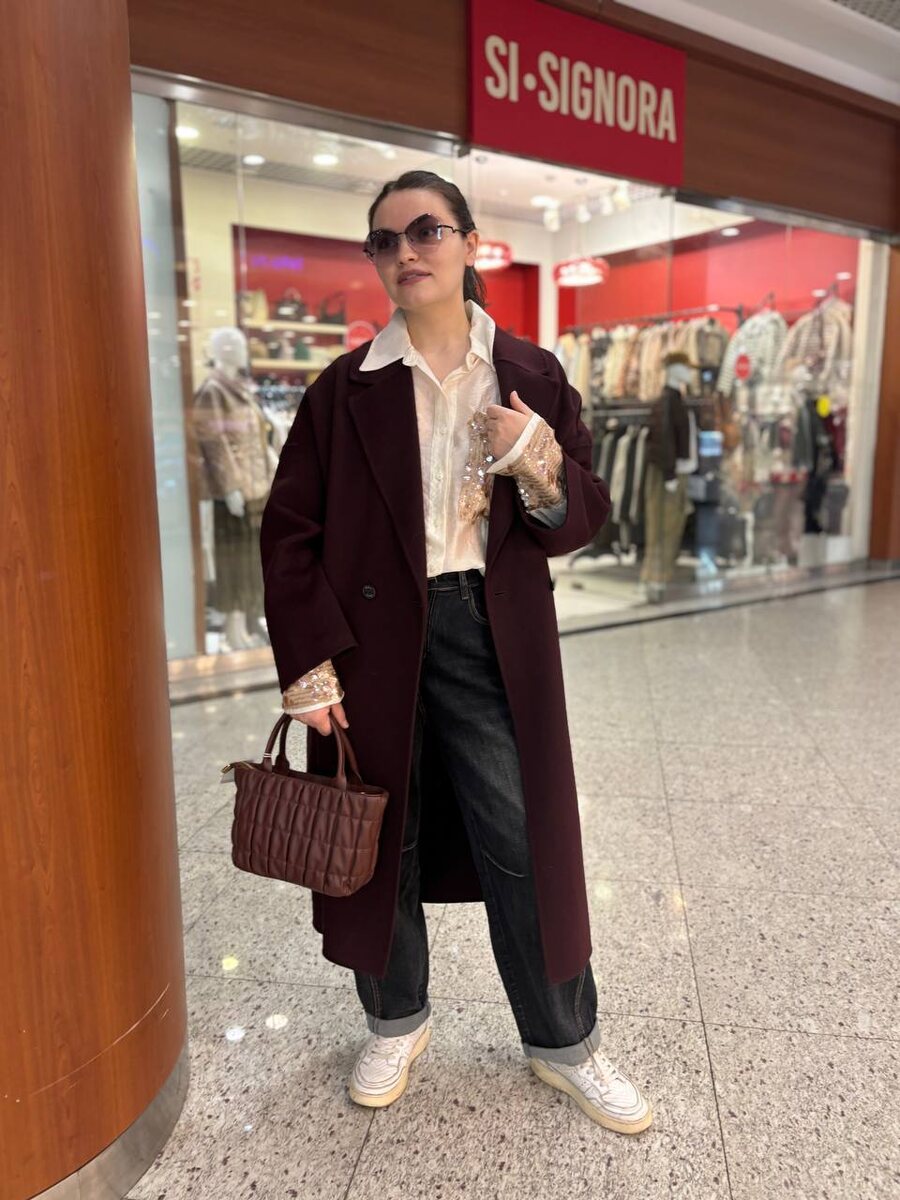 Стильный образ с винным пальто VICOLO Italy 🇮🇹 Итальянская рубашка в пайетках - украшение образа! Из аксессуаров сумочка бордовая из