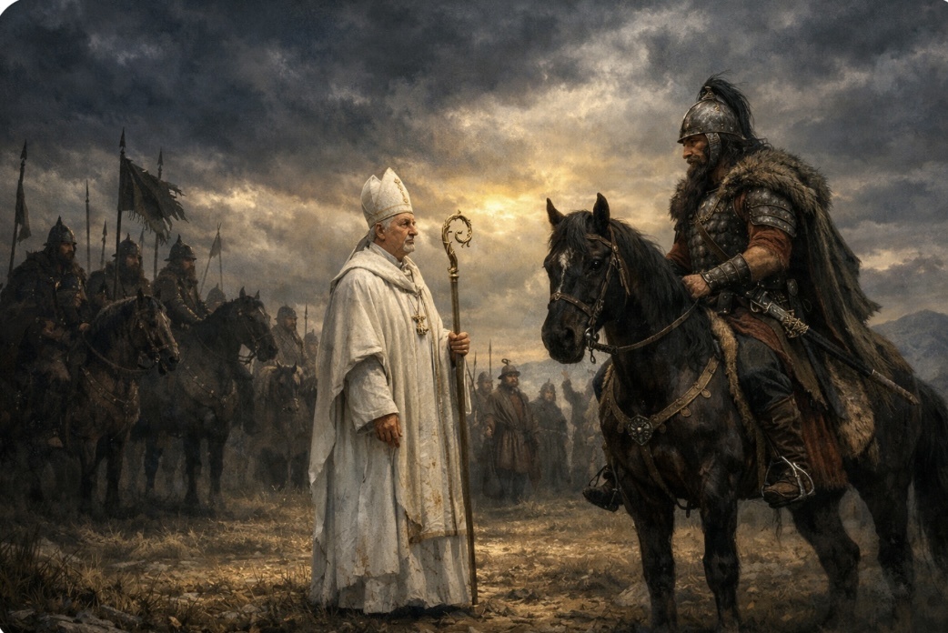 Их встреча произошла близ реки Минчо, неподалёку от Мантуи. С одной стороны — шатры кочевников, знамёна, конница, лица, закалённые степным ветром. С другой — несколько римских послов и седовласый архипастырь.