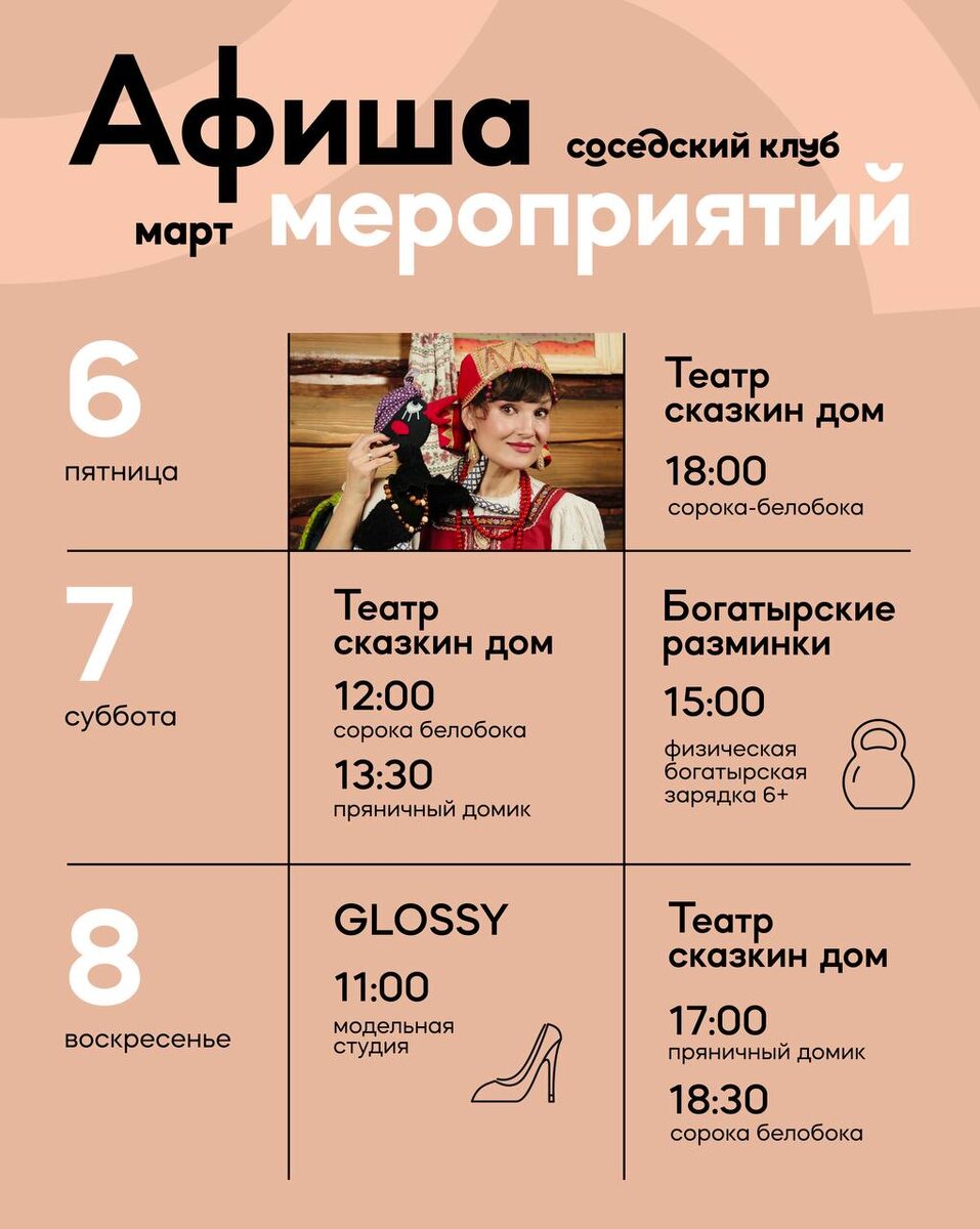 ! 🌟 С 6 по 8 марта в нашем соседском клубе: 🎪 Театр «Сказкин дом» с любимыми героями 🏋️ Богатырские разминки для сильных и ловких 👗 Модельная студия GLOSSY для юных модниц Для вопросов и записи: +7 (911) 956-49-53 Антонина +7 (987) 071-98-79 Сергей личные сообщения vk.com/club222629903