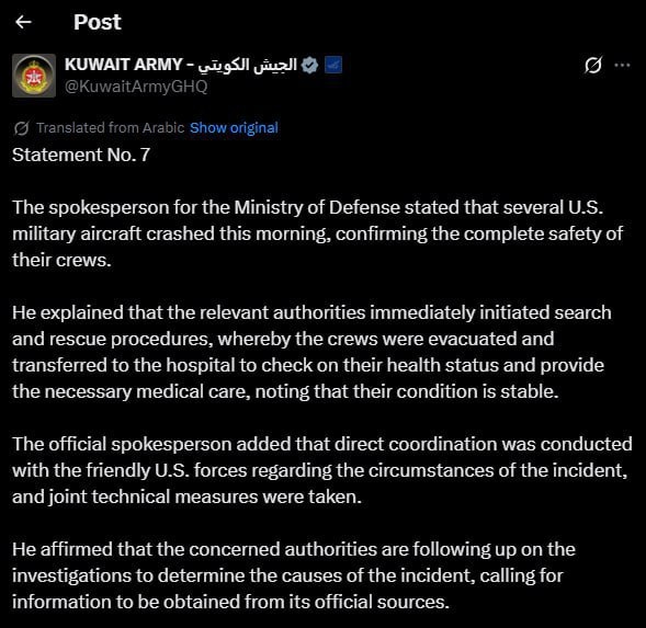 ! В Кувейте произошло несколько инцидентов с боевыми самолетами ВВС США. Официальный представитель оборонного ведомства страны сообщил, что все пилоты были успешно спасены. Утром в социальных сетях появились видео с падением истребителя F-15E Strike Eagle и последующим спасением американских летчиков. Иранские СМИ утверждают, что самолеты были сбиты средствами ПВО Ирана, однако официальных подтверждений от Пентагона пока не поступало. Известно, что три пилота катапультировались. Среди пилотов, управлявших одним из сбитых F-15, была женщина. Подписаться: За Брата 🇷🇺