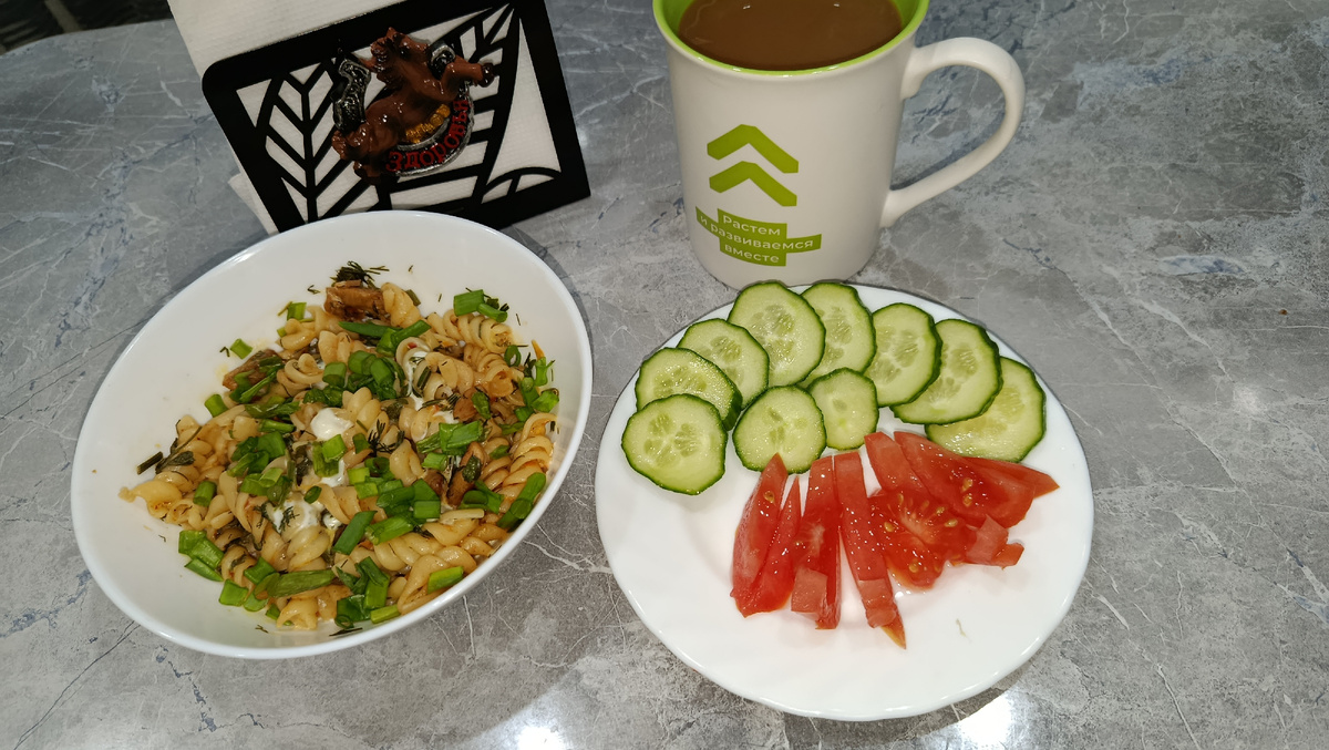 Сегодня на завтрак тестирую макароны из твердых сортов пшеницы .Отварила макароны,добавила к ним обжаренные с луком грибы и вбила одно небольшое яйцо.Все прогрела на небольшом огне ,под крышкой.Посыпала зелёным луком .Вес макарон 180 г. Добавила нарезку из огурцов и помидоров 100 г.Вес завтрака 280 г.Выпила цикорий с молоком без подсластителя.