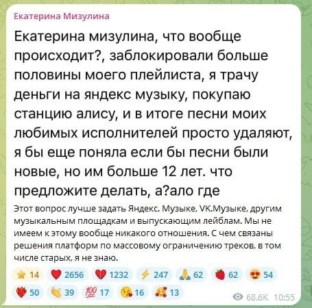 🤷♂️ ЕКАТЕРИНА МИЗУЛИНА НЕ ЗНАЕТ, КТО ЦЕНЗУРИТ МУЗЫКУ В РОССИИ! Глава Лиги безопасного интернета заявила, что ей неизвестно, с чем связаны массовые блокировки треков на российских стримингах, и она не имеет отношения к цензурированию песен и обложек — под раздачу попадают не только отечественные исполнители, но и западные артисты вроде Playboi Carti и Кендрика Ламара, у которых режут слова и убирают обложки. 💀 FML MATTERS