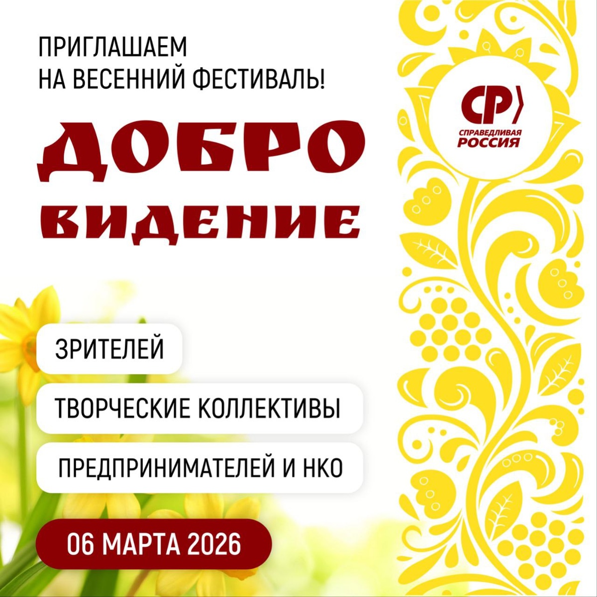 ! Спешим напомнить: уже в эту пятницу состоится ежегодный весенний концерт-фестиваль от Справедливой России — ДоброВидение! В этом году главная тема фестиваля — семейные традиции. В программе: выставки и ярмарки, мастер-классы и подарки, выступления оренбургских артистов и народных коллективов Оренбуржья. Вход свободный! Узнать подробнее и записаться для участия можно на сайте: добровидение56.рф 📍Когда: 06 марта (с 15:00 работа площадок, с 16:00 концертная программа) 📍Где: Оренбург, ДК Экспресс, пр-т Парковый 15 Если вы хотите показать свой талант на сцене, рассказать о своей организации или движении на выставке, представить товары своего производства на мини-ярмарке в холле или просто насладиться атмосферой фестиваля и посмотреть выступления участников — это событие для вас! Организаторами фестиваля выступают: Справедливая Россия в Оренбуржье, Социал-демократический союз женщин России и Молодёжь Справедливой России при поддержке депутата Госдумы Валерия Гартунга.