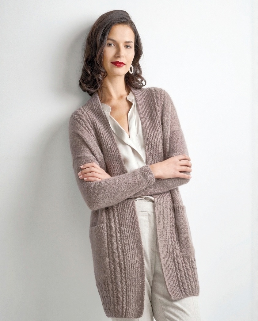 Для вязания нам потребуется 4 [4: 5: 5: 6] мотков коричнево-розовой пряжи: 46% мохер, 24% нейлон, 20% мериносовая шерсть, 20% полиэстер; 50 г/250 м. Спицы круговые 3,25 мм и 4 мм.