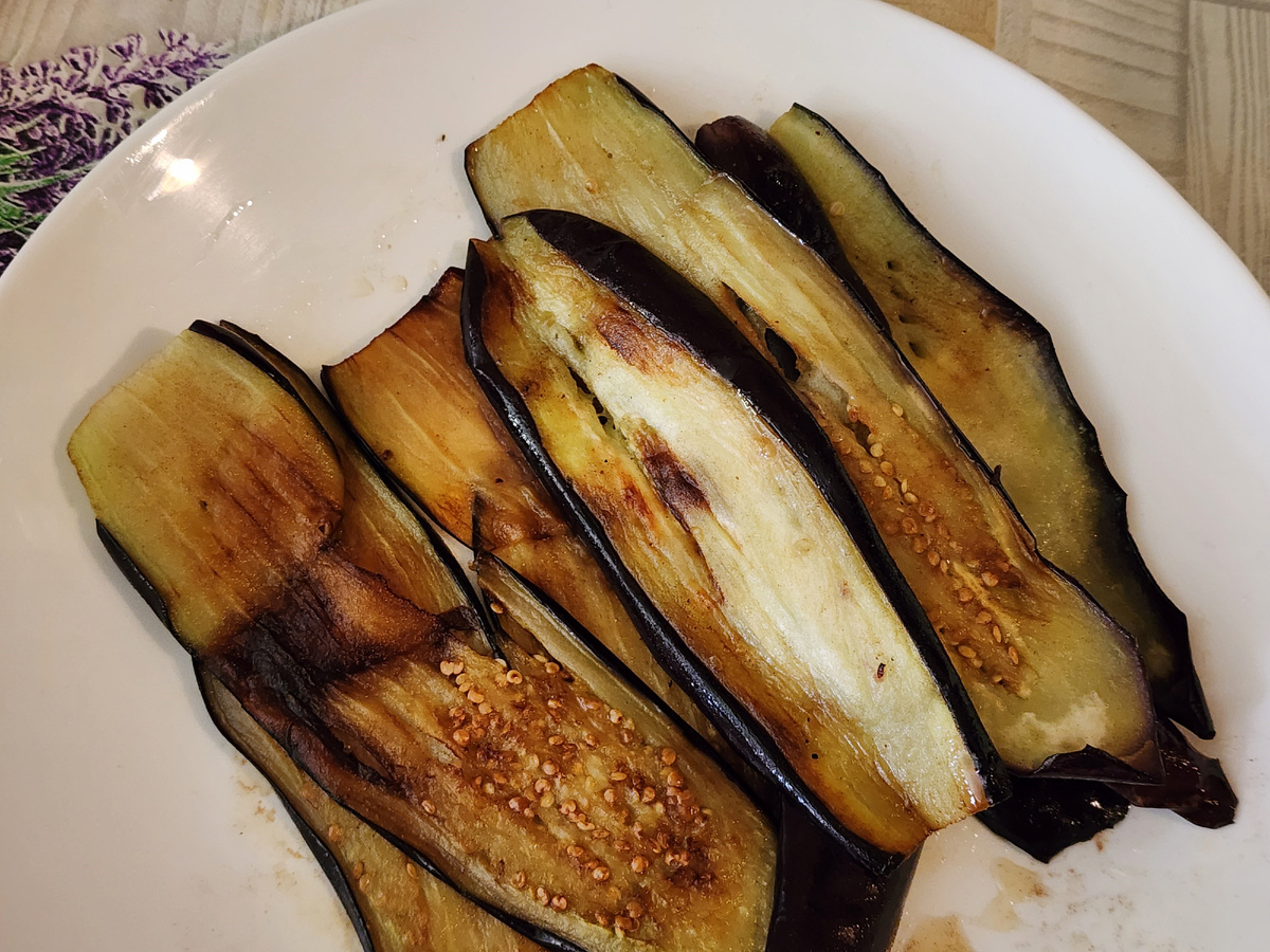 Салат из печеных баклажанов и шампиньонов.
