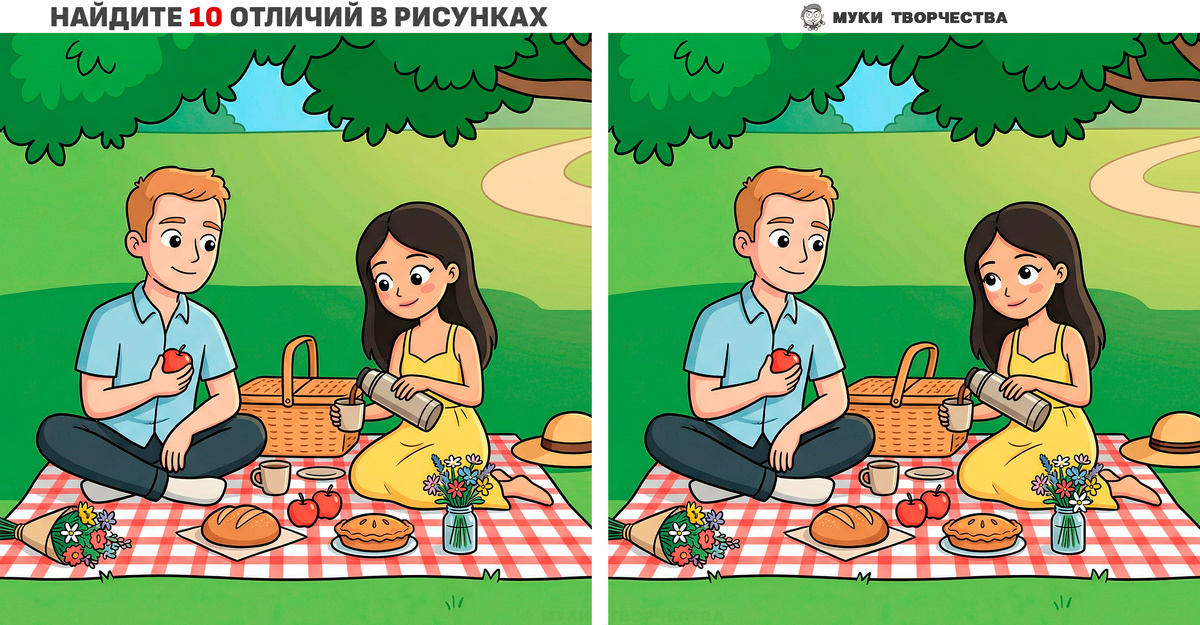 Сегодня у нас простое, но интересное задание на внимательность с крупными формами, как вы и просили. Две похожие романтические картинки с влюблённой парой, устроившей пикник под деревом в парке. Картинки действительно очень похожи, но в одной художник специально сделал десять отличий. Проверьте, насколько вы внимательны к деталям. Отыщите все 10-ть отличий без подсказки. Она, конечно, будет в конце статьи, но рекомендую использовать её для проверки своих предположений. Надеюсь, вам понравится данное упражнение на развитие концентрации внимания и зрительной памяти. Буду рад лайкам и комментариям – это вдохновляет и помогает развивать канал. Горизонтальная версия теста: Пикник в городском парке Вертикальная версия теста: Пикник в городском парке Оу! Тут Есть Ещё Тесты На Внимание: ПОДСКАЗКА (ОТВЕТ) ниже: