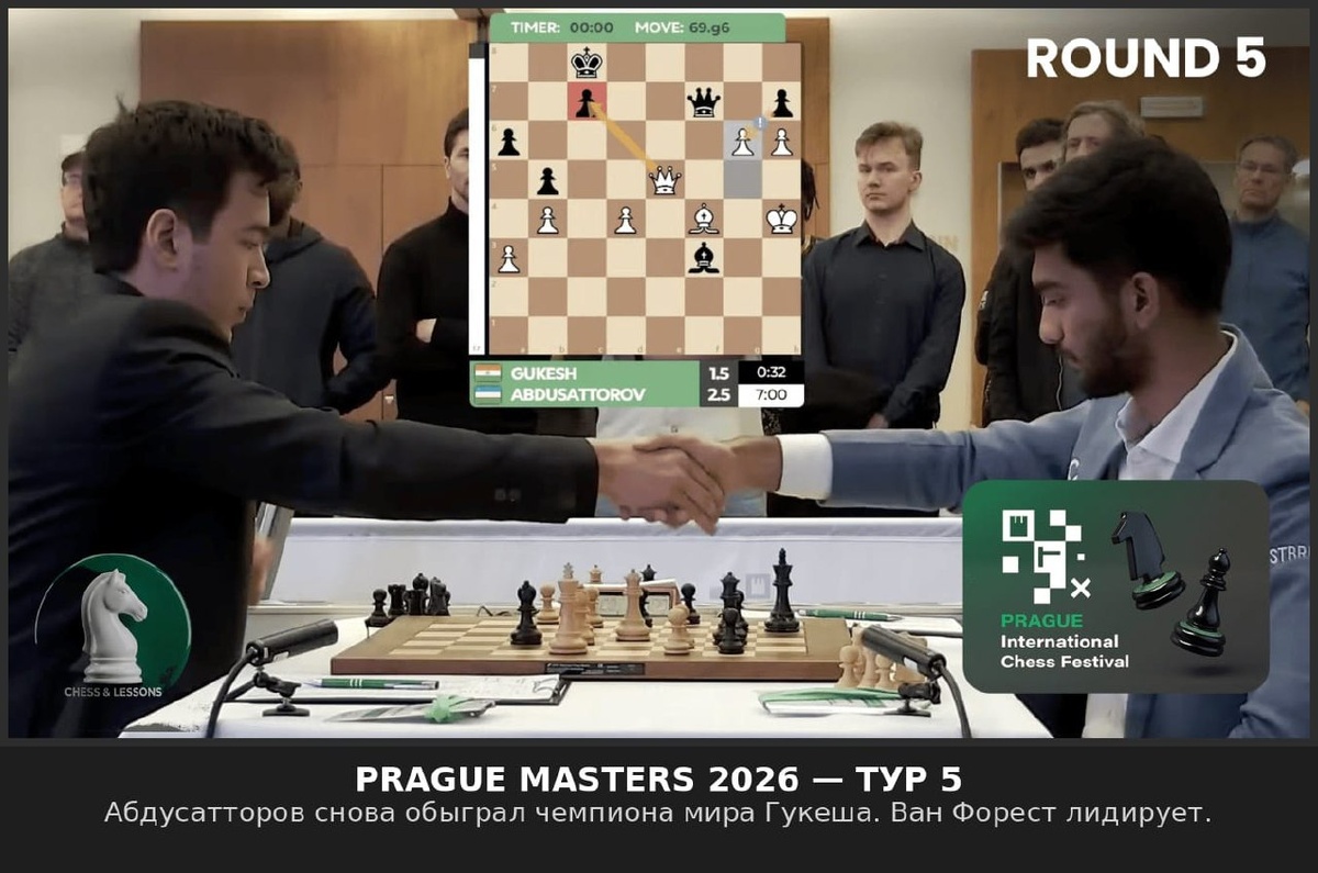 Абдусатторов в третий раз за 2026 год обыграл чемпиона мира Гукеша: тот имел перевес из дебюта, но в цейтноте зевнул на 67-м ходу и сдался через два хода. Лидирует Ван Форест (4/5), Абдусатторов и Навара делят второе место (3.5). Гукеш упал на 17-е место в live-рейтинге.