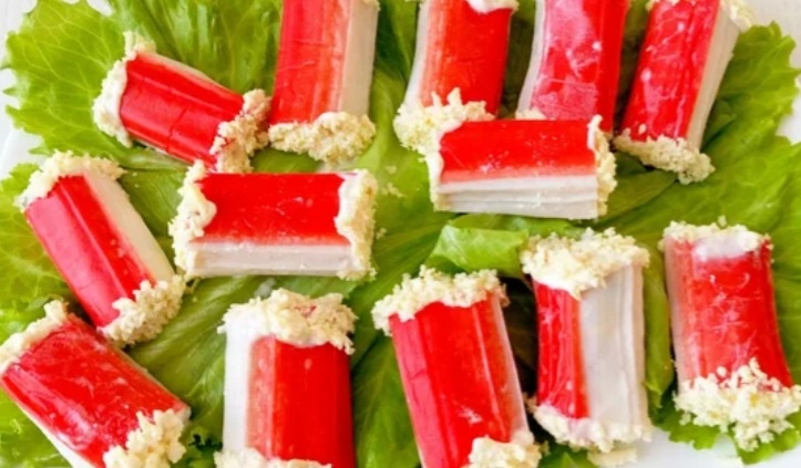 Приготовление: 9. На каждый крабовый пласт равномерно распределить начинку, оставить один край свободным. 10. Скатывать каждую палочку в трубочку и выложить на ровную поверхность.