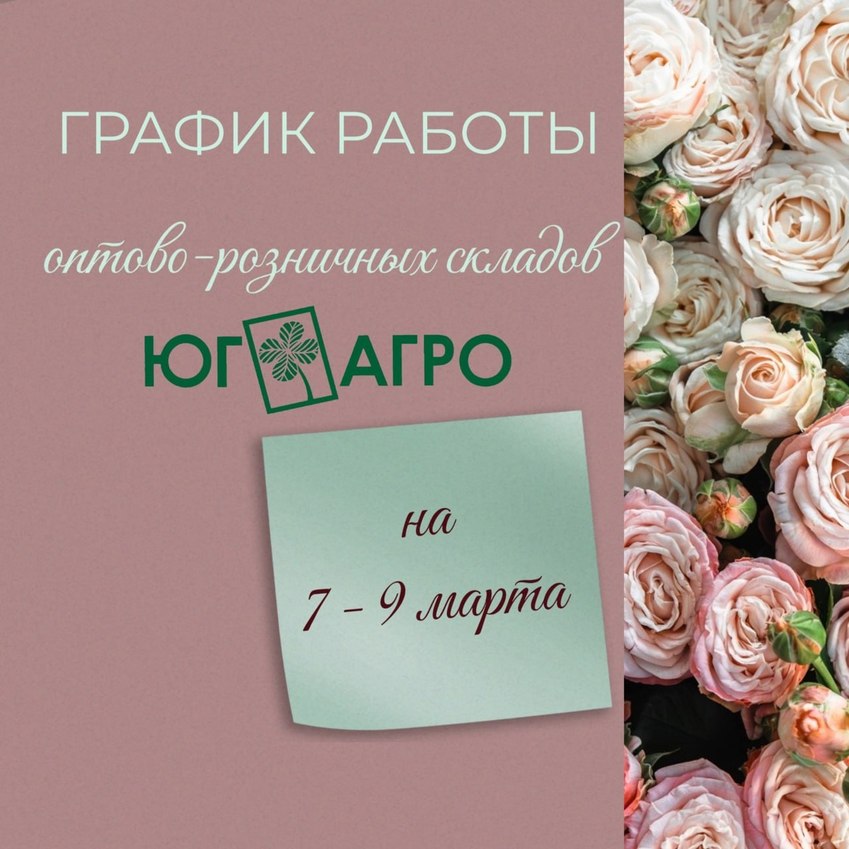 Чтобы вы успели закупиться самыми свежими розами и тюльпанами вовремя, ловите график работы в праздничные дни👇 🌷 Станица Ярославская, территория «Тепличный комбинат» +7 (989) 818 60-60 доб. 6 +7 (988) 557 13-67 ⭐ 7, 8, 9 марта — рабочие дни 🌷 г. Воронеж, ул. Дорожная, д. 88 +7(989)818 60 60 доб. 2 +7 (988) 358 01-18 ⭐ 7 марта — рабочий день 8, 9 марта - выходные дни 🌷 г. Краснодар, ул. 40-летия Победы, д. 129/2, Цветочный рынок +7 (989) 818 60-60 доб. 3 +7 (988) 358 01-25 ⭐ 7, 8, 9 марта — рабочие дни 🌷 г. Ставрополь Старомарьевское шоссе, д. 23 +7 (989) 818 60-60 доб. 5 +7 (918) 862 06-00 ⭐ 7, 9 марта — рабочие дни ⭐ 8 марта — выходной день 🌷 г. Ростов-на-Дону ул. Береговая, д. 4 +7 (989) 818 60-60 доб. 4 +7(918)852 68-16 ⭐7, 9 марта — рабочие дни ⭐8 марта — выходной день