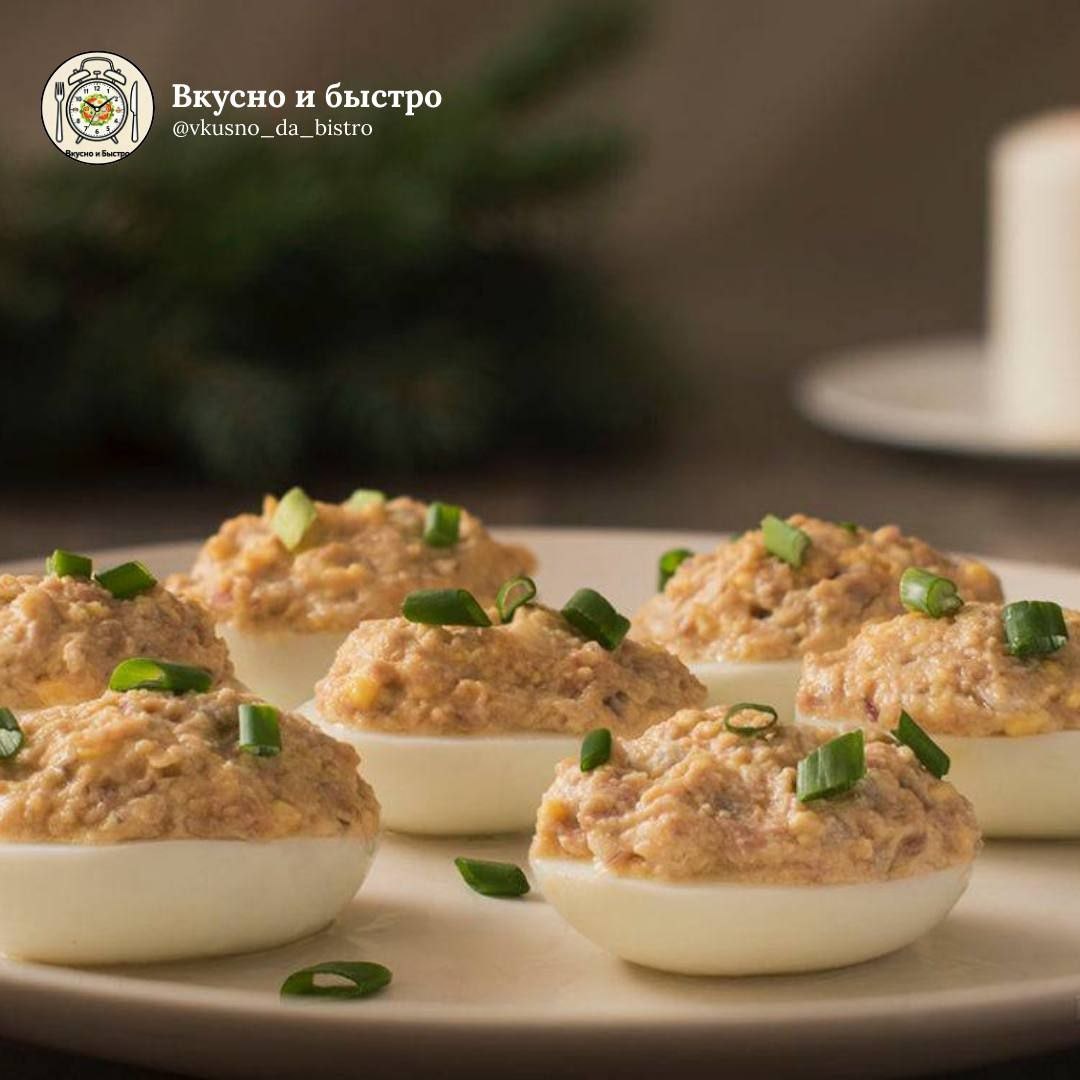 #закуска #30мин 🕒 Время приготовления: 25–30 минут Порции: 4 Сложность: легко 🧾 Ингредиенты: 🟠Яйца — 8 шт 🟠Плавленый сыр — 100 г 🟠Печень трески — 100 г 🟠Чеснок — 1 зубчик 🟠Майонез — по вкусу 🟠Соль, перец — по вкусу 🍴Приготовление: 1. Яйца отварите вкрутую (около 10 минут после закипания). Остудите в холодной воде, очистите и разрежьте пополам. Аккуратно отделите желтки от белков. 2. Желтки натрите на мелкой тёрке вместе с плавленым сыром. Печень трески разомните вилкой. 3. Соедините желтково-сырную массу с печенью трески, добавьте измельчённый чеснок, соль, перец и немного майонеза. 4. Перемешайте до однородности. 5. Наполните половинки белков получившейся начинкой (удобно с помощью ложки или кондитерского мешка). Вкусно и Быстро | Мы в Мах 📲