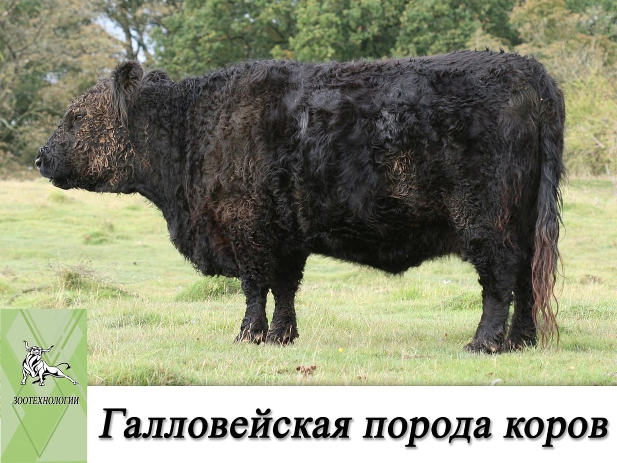 Галловейская порода коров 📖 Галловейская порода – одна из старейших специализированных мясных пород. Была выведена в Шотландии в графстве Галловей в XIX веке. Изначально скот был мясомолочного направлении, вследствие селекции стал только мясного. В России стадо галловейских коров пока небольшое. 🐄 Описание породы коров галловей: Скот галловейской породы комолый, черной масти, допустим темно-бурый или серо-желтый окрас, с широким белым поясом от задних углов лопаток до поясницы. Туловище удлиненное, телосложение пропорциональное. Шея широкая, грудь глубокая, поясница короткая, спина ровная, широкая, ноги короткие с крепким копытным рогом. Костяк хорошо развит. Конечности и копыта крепкие, благодаря чему животные могут делать большие переходы в поисках корма. Шерсть жесткая, с волнистыми тонким подшерстком. Длина волосков достигает 20см. 🍀 Продуктивность: Живая масса коров составляет 450-500 кг, быков – 700-800 кг. Среднегодовой удой 1500 кг. Содержанием жира в молоке – 4,0%. Тел