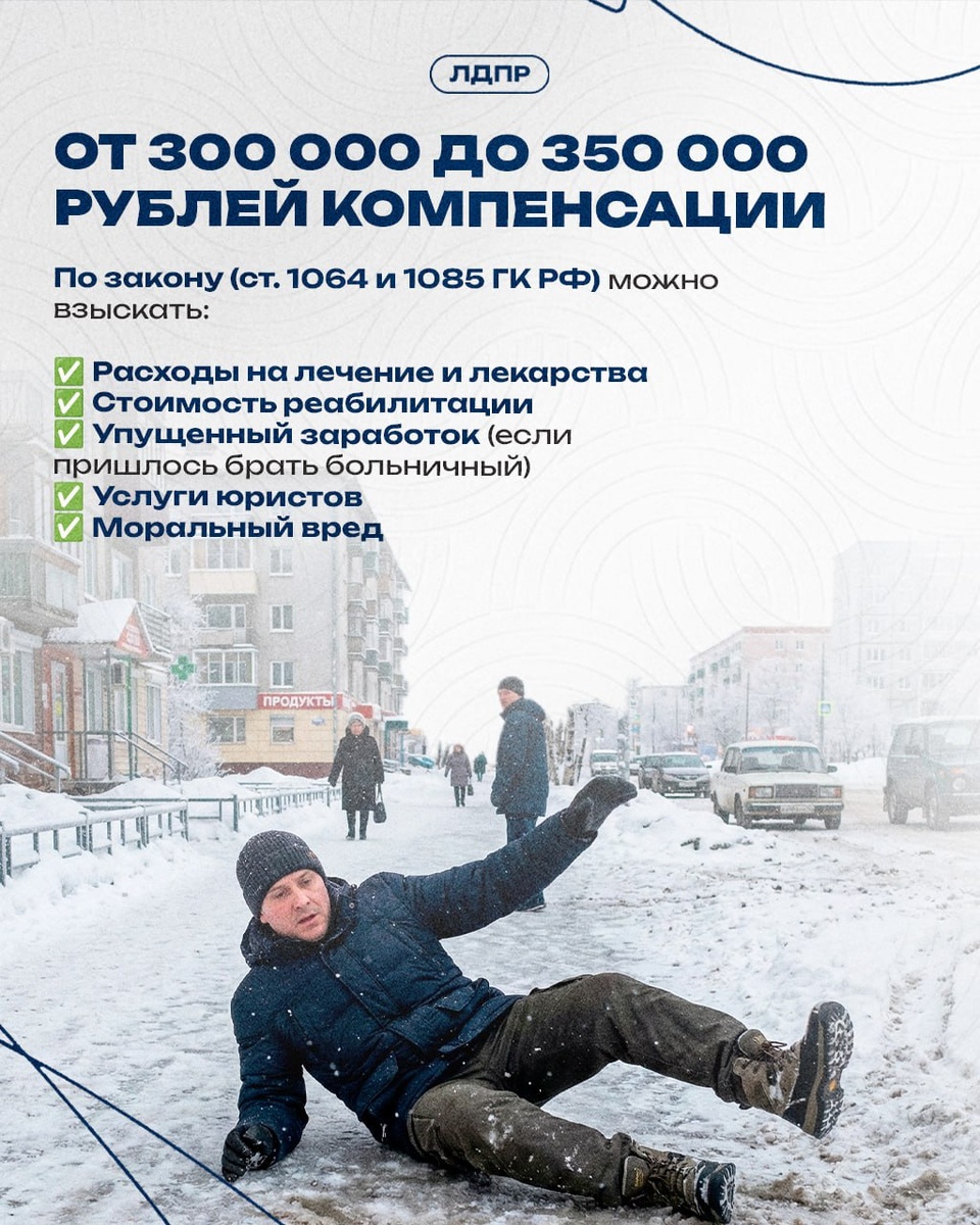 ❄️ Многие считают, что падение в гололёд — это досадная случайность. Но закон на вашей стороне: компенсации в 300–350 тысяч рублей — действующая судебная практика. Деньги помогут восстановить здоровье и компенсировать упущенное время. ➡Подготовили пошаговую инструкцию, как получить выплату, если случилась беда. Листайте карточки и сохраняйте в закладки!