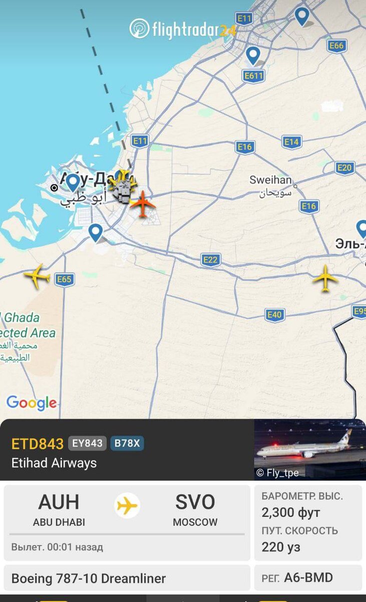 ⚡️Первый рейс в Москву вылетел из Абу-Даби. Расчетное время прибытия борта Etihad в Шереметьево - 21:36.