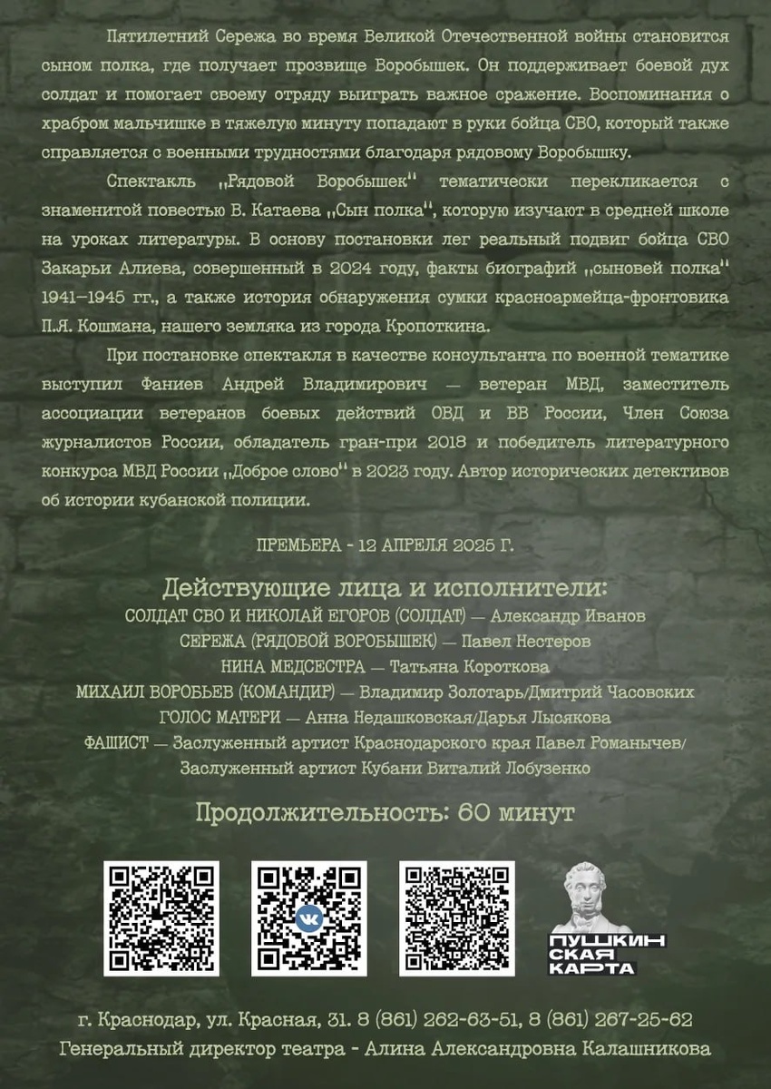Дорогие родители! Приглашаем вас и ваших детей на пронзительный спектакль Краевого театра кукол о мужестве, дружбе и силе духа. ________________________________________ О ЧЁМ ЭТОТ СПЕКТАКЛЬ? Это история о шестилетнем Серёже, который во время Великой Отечественной войны становится сыном полка и получает прозвище Воробышек. Маленький мальчик, потерявший родных, находит в себе силы помогать солдатам, поднимать их боевой дух и даже участвует в важных сражениях. Спектакль основан на реальных событиях — историях детей-героев войны, которых называли «сыновьями полка». Во время Великой Отечественной в Красной армии служило более 3500 фронтовиков младше 16 лет ________________________________________ ПОЧЕМУ СТОИТ ПРИЙТИ? ✨ Важные ценности — спектакль учит храбрости, взаимовыручке и любви к Родине ✨ Историческая правда — консультантом выступил ветеран боевых действий Андрей Фаниев ✨ Доступно детям — история подана в формате военной сказки (6+) ✨ Не перегружает — продолжительность всего 60 минут