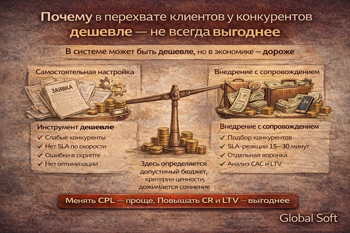 В B2B с чеком от 30–50 тыс. ₽ и выше перехват клиентов у конкурентов напрямую влияет на CAC (стоимость привлечения клиента), LTV и маржинальность сделки. Если CRM (amoCRM, Bitrix24 и др.) фиксирует заявки, лиды приходят стабильно, но конверсия в сделку нестабильна, цикл переговоров удлиняется, а давление по цене растёт — проблема чаще всего не в технологии. Проблема в том, кто управляет процессом. Перехват клиентов у конкурентов в B2B — это не просто доступ к системе. Это модель работы со стадией выбора через поведенческие сигналы и интеграцию в CRM, которая влияет на экономику сделки. И от того, внедрён ли этот процесс «под ключ» или отдан клиенту на самостоятельную настройку, зависит результат. Когда бизнес подключает перехват клиентов у конкурентов, он покупает не контакты. Он покупает: Но чтобы это произошло, нужно не просто подключить инструмент. Нужно управлять процессом. На рынке есть два типа моделей. Компания получает инструмент. Дальше она: Формально всё работает. Лиды идут.