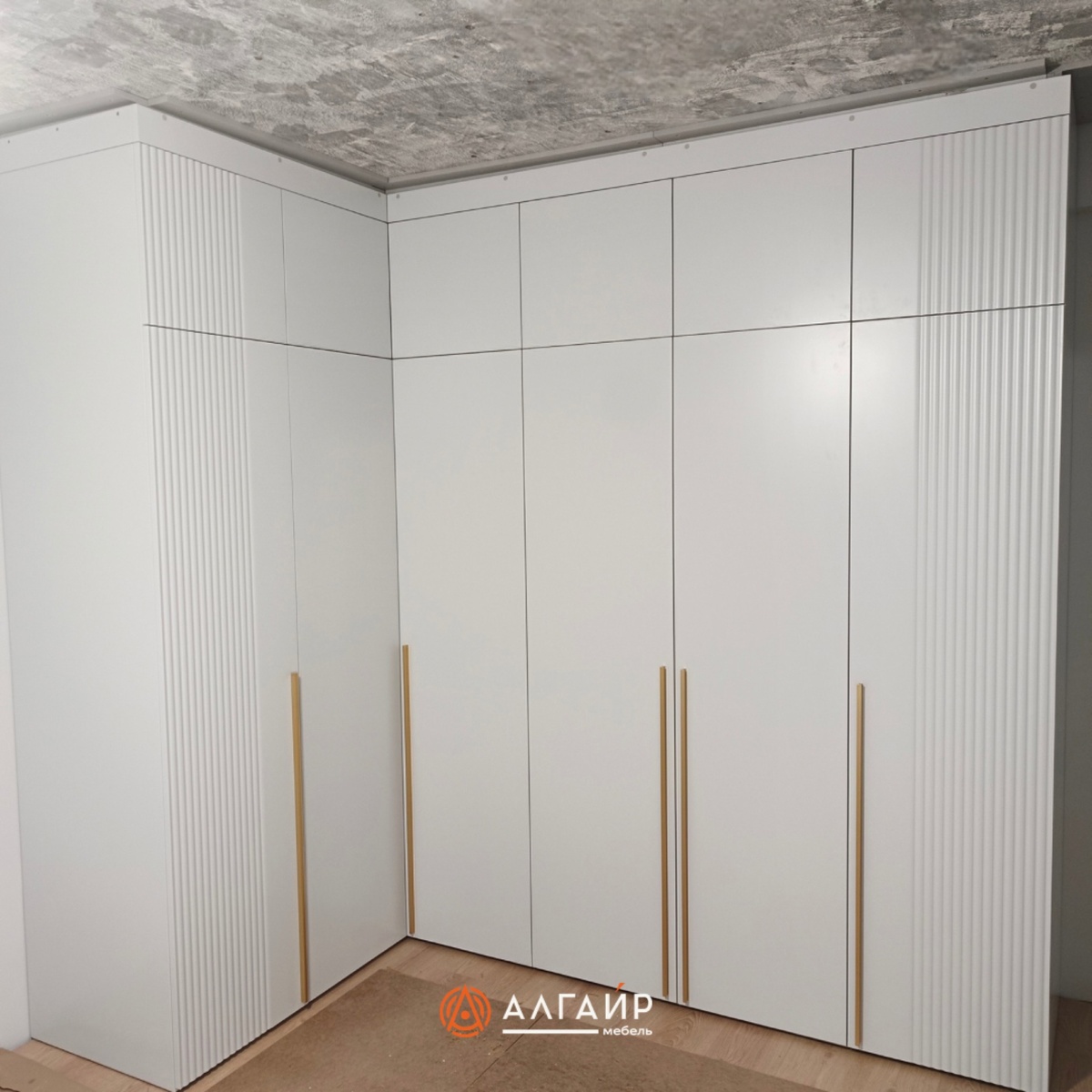 Шкаф реализовали от пола до потолка, с аккуратными вертикальными ручками тёплого золотистого оттенка. Продумали внутреннее наполнение логичными секциями и удобными выдвижными ящиками 🤌🏾