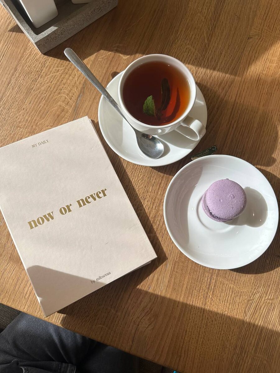 Я сегодня работала не дома, а в кафе за чашечкой чая с черничным макарунс