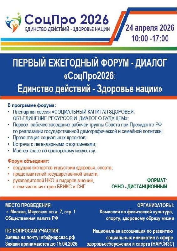 » 💚Дата проведения: 24 апреля 2026 г. 💚Время проведения: 10:00 – 17:00 ч. 💚Место проведения: г. Москва, Миусская площадь, д.7, стр.1, БКЗ, 5 этаж. 💚Организаторы: Комиссия ОПРФ по физической культуре, спорту, здоровому образу жизни, Национальная ассоциация социальных инициатив в сфере здоровьесбережения и спорта (НАРСИЗС) Форум «СОЦПРО 2026» объединит ведущих экспертов индустрии здоровья, спорта, представителей государственной власти, профессионального сообщества, руководителей НКО и лидеров мнений, в том числе из стран БРИКС и СНГ, вовлеченных в социальную повестку в целях развития сотрудничества и продвижения новых подходов в области здоровья, спорта, активного долголетия, повышения качества жизни граждан. Форум призван стать точкой сборки для сотен социальных проектов и инициатив в сфере массового спорта, здорового образа жизни, поддержки семьи и адаптивного спорта. Мы соберём вместе тех, кто формирует политику, и тех, кто реализует её на местах. Наша задача — не просто обсуди