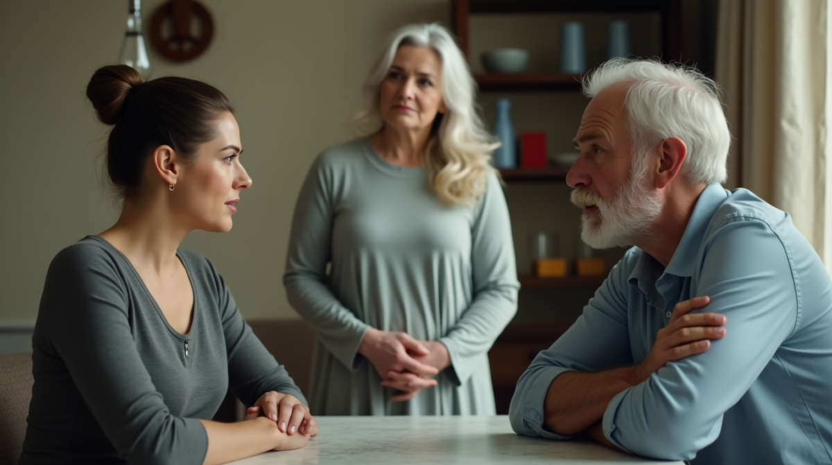 Рядом с ней стоял Николай Васильевич, высокий, немного сутулый мужчина с седыми висками, который привычно молчал, глядя в пол прихожей, словно надеялся, что пол поглотит его неловкость. Алина стояла в дверях кухни, всё ещё держа в руках кухонное полотенце, которым только что вытирала руки после мытья посуды. Вечерний свет из окна гостиной падал на ковёр мягкими золотистыми полосами, но сейчас этот уютный, привычный свет казался Алине каким-то чужим, почти враждебным.