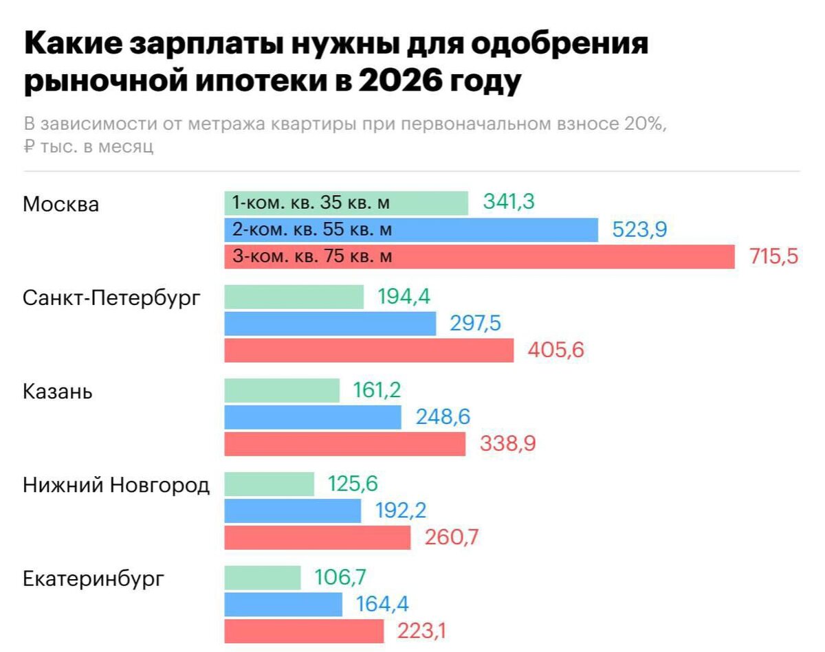 И на днях читал прогнозы аналитиков — многие сходятся во мнении, что к концу года она может быть в районе 13–14%. Что это значит? При такой ставке массовая рыночная ипотека всё равно полноценно не «полетит». Скорее всего, ставка по кредиту будет около 15%. Это всё ещё много. Но рынок уже начнёт оживать — однозначно. ⸻ Но сегодня хотел поговорить о другом. Есть интересная диаграмма — сколько нужно зарабатывать, чтобы банк одобрил рыночную ипотеку. 📍 Москва. Однушка. Чтобы купить её сегодня, нужно зарабатывать примерно 341 300 ₽ в месяц. Цифра звучит внушительно. При том что средняя зарплата по Москве на конец прошлого года — около 170 000 ₽. Кажется: «Нереально». ⸻ А теперь давайте посмотрим глубже. Важно ведь не только сколько стоит квартира, а сколько она стоит относительно годового дохода. 2019 год: ▪ средняя зарплата — ~70 000 ₽ ▪ однушка — около 5 млн ₽ 2025–2026: ▪ средняя зарплата — ~170 000 ₽ ▪ самая бюджетная однушка — чуть больше 10 млн ₽ И что мы видим? В отно