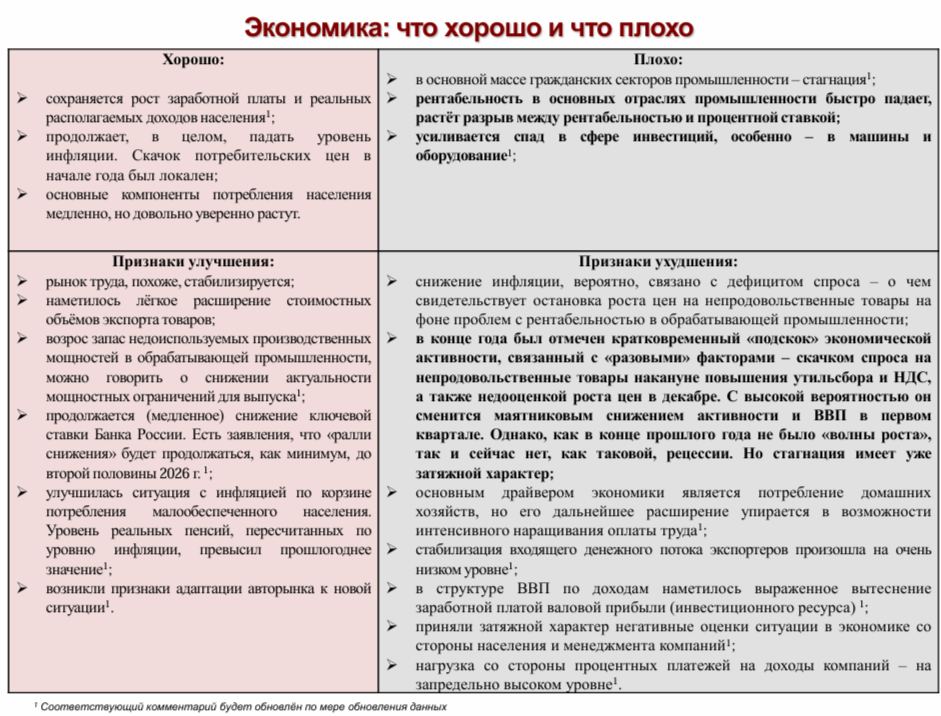 Давно я не разбирал аналитические отчеты от ЦМАКП, а там всегда много интересного, хоть и составлены они чрезмерно "профессиональным" языком, видимо, чтобы было непонятно и скучно читать простому обывателю. Но в них всегда есть краткая преамбула о самом важном, а также вот такая таблица "что хорошо и что плохо", которая тоже более-менее будет ясна и понятна каждому. Давайте просто разберем эти ключевые моменты. Подчеркиваю, что так видят ситуацию не какие-то сторонние или оппозиционные аналитики, а макроэкономисты, работающие на администрацию президента и правительство, готовящие эти отчеты непосредственно для них. Итак, что же плохого видит ЦМАКП в российской экономике? Во-первых - стагнацию "в основной массе гражданских секторов промышленности". Стагнация - это околонулевая динамика, топтание на месте. И далее подчеркивают, выделяя жирным, что "стагнация имеет уже затяжной характер". ЦМАКП считает, что рецессии пока нет (хотя по показателям она есть, но они пишут, что нынешний спад с