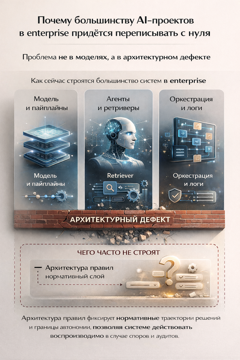 Именно поэтому многие текущие AI-инициативы столкнутся с необходимостью пересборки. Не потому, что они плохие. А потому, что они проектировались как инструменты, а не как нормативные системы.
