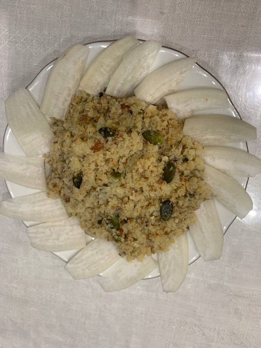 🤭 А теперь отвечаю на вопрос: на фото была представлена цветная капуста. 😉 Ну, как вам ответ? 😉😁 Мне захотелось приготовить что-либо из цветной капусты, но интересного чтобы можно было поделиться с вами. И вот делюсь с вами своим рецептом из цветной капусты, по мне так больше похоже на булгур получилось ) #Булгур из цветной капусты Ингредиенты: · Цветная капуста — 300 г (в ход идёт всё: и соцветия, и сочная кочерыжка) · Помидор — 1 крупный (или 4 черри) · Чеснок — 1 зубчик · Петрушка — 30 г свежей или 1 ч.л. сушёной (у меня была сушеная домашняя) · Миндаль — 40 г · Масло оливковое — 2 ст. ложки (или комбинируй: 1 ложка обычного + 1 ложка от вяленых помидоров для аромата) · Сок лимона — 1 ст. ложка · Соль — примерно ¼ ч.л. · Адыгейская с травками или обычная соль — по вкусу · Чёрный перец — по желанию · Готовая салатная смесь по желанию 1. Разбираем капусту на соцветия. Кочерыжку не выкидываем! Всё вместе отправляем в блендер и пробиваем до состояния мелкой крупы — должно быт