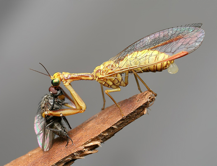 Так, ну и на что мы сейчас смотрим? Богомол ест муху? Или не богомол… Но точно муху. И точно ест! Всё верно, перед вами вовсе не богомол, а совершенно чудное создание по имени мантиспа. И несмотря на невероятное сходство с богомолами, никаких родственных связей она с ними не имеет, являясь представителем отдельного отряда сетчатокрылых. Треугольная голова, шипастые передние лапки-хваталки, характерные движения и метод охоты кажутся истинно богомольими, но это всего лишь результат конвергентной эволюции, причудами которой мы с вами восхищались уже не раз. Встретиться с одним из видов этих чудесных насекомых можно в абсолютно разных регионах – от Африки и двух Америк до Европы и даже юга Сибири. Но где бы не жили мантиспы – в буйных тропиках или лесах Северного Кавказа – всех их объединяет одно: ненасытная хищность и оригинальный способ выращивания личинок. Этот парень считает пойманную мантиспу совершенно безопасной и, конечно же, причинить вред человеку она не способна, ведь ни жалом,