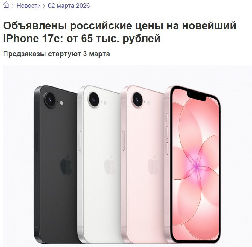iPhone 17e будет стоить от 🔴🔴 тысяч рублей в России — ритейлеры поделились прайсом. Базовый вариант на 256 ГБ обойдется в 65 тысяч рублей, а версия на 512 ГБ — в 85 тысяч. Напомним: из главных плюшек — свежий чип A19, полноценный MagSafe и очень приятный розовый цвет. Дамы, вы знаете, кому скинуть 👉 CtrlAltDelights- подписаться