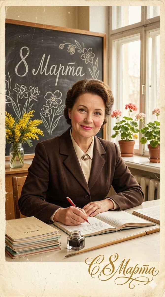 Промпт - праздничная открытка С 8 Марта учителю в ретро стиле