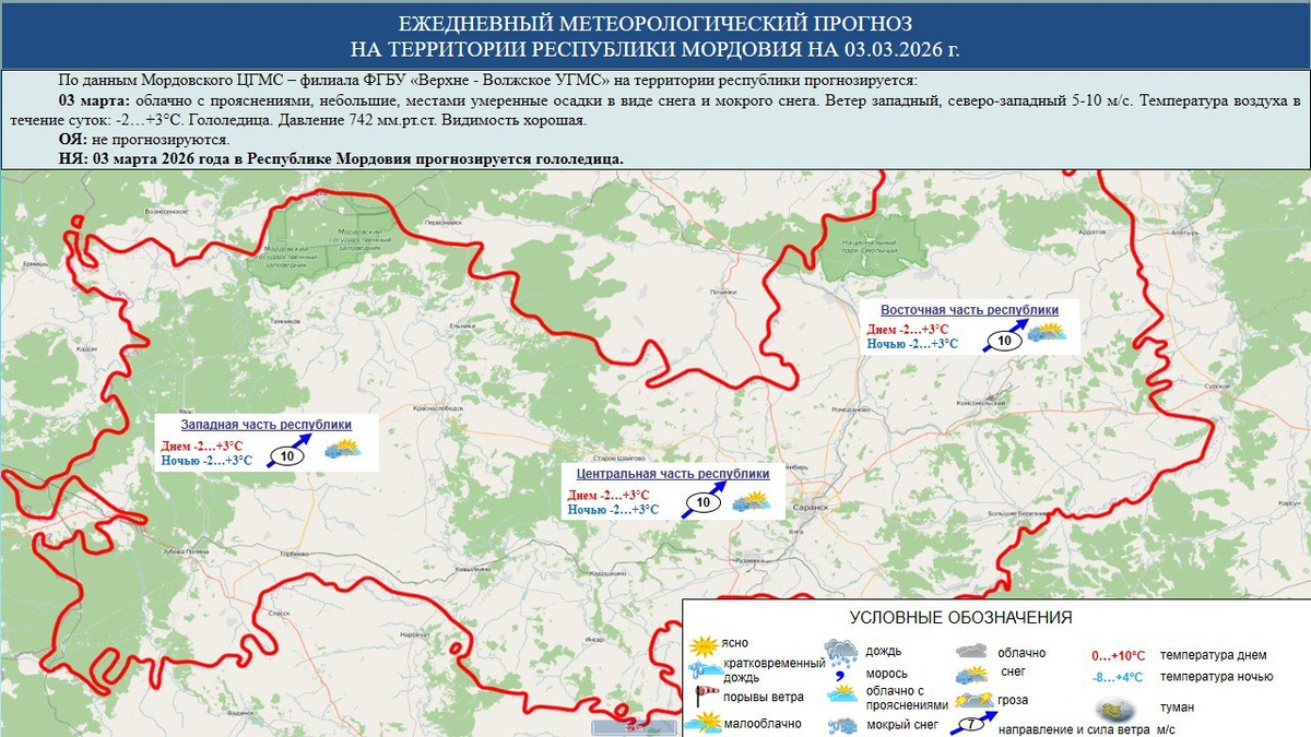 ☁️⛅⛈️ 3 марта в Мордовии облачно с прояснениями, небольшие, местами умеренные осадки в виде снега и мокрого снега, гололедица