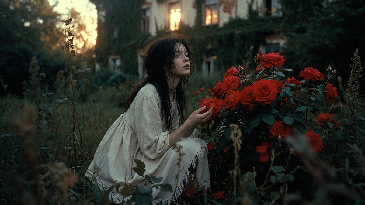 В заброшенных поместьях всегда живут призраки. Иногда они бродят по коридорам со скрипучими половицами, иногда прячутся в старых зеркалах, а иногда... иногда они застывают в кустах дикого шиповника и смотрят на тебя глазами, полными вековой тоски.