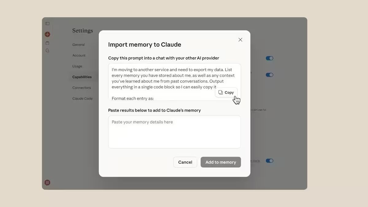Anthropic представила инструмент, который даёт её ИИ-чатботу Claude возможность импортировать историю и контекст диалогов из других популярных ИИ, включая ChatGPT, Gemini и Copilot. Это значит, что теперь можно легко перенести разговор с одного ассистента на другого, сохранив всю смысловую цепочку и продолжить общение без потери контекста. Ещё по теме: Технология работает через специальный «memory import tool»: из предыдущих чат-ботов вытягиваются воспоминания и детали взаимодействия в виде текстового промпта. Его достаточно вставить в память Claude, и в течение примерно суток ИИ проанализирует предоставленную информацию. Пользователь может проверить, что именно ИИ запомнил, а также без проблем изменить или удалить эти данные в разделе «Manage memory». ⚡Подписывайтесь на канал itzine и канал подкаста ForGeeks в Telegram! Там самые свежие новости про технологии, гаджеты и космос. Anthropic подчёркивает, что Claude ориентирован на деловое общение и не сохраняет личную информацию вне рабо