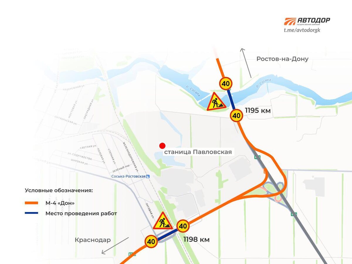 После завершения ремонта конструкции будут соответствовать современным нагрузкам На трассе М-4 «Дон» в Павловском районе начинаются ремонтные работы на двух искусственных сооружениях. Дорожники обновят мост через реку Сосыка на 1195 км и путепровод через железную дорогу на 1198 км у станицы Павловская. На период ремонта на этих участках будет снижена максимальная скорость движения — до 40 км/ч. В ходе работ заменят балки пролетных строений, дорожное покрытие, перильное и барьерное ограждения. После завершения ремонта конструкции будут соответствовать современным нагрузкам. Завершить работы и ввести объекты в эксплуатацию планируют в 2027 году. Водителей просят учитывать эту информацию при планировании поездок.