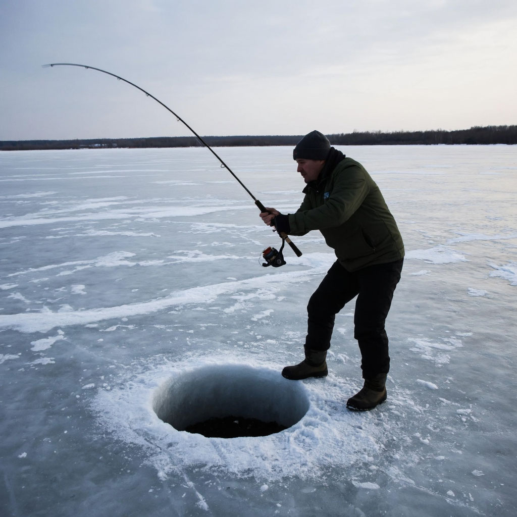 После подсечки — ни секунды промедления. Тащим рыбу в лунку без остановки, выбирая леску руками широкими движениями. Если дать слабину, судак уйдет в коряги, и всё — прощай, снасть.