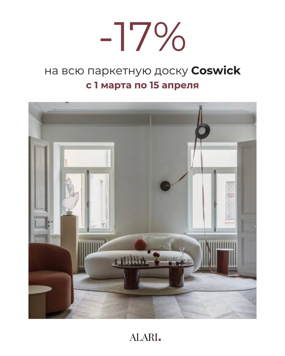 С 1 марта по 15 апреля у Coswick действует весенняя акция: скидка 17% на всю паркетную продукцию