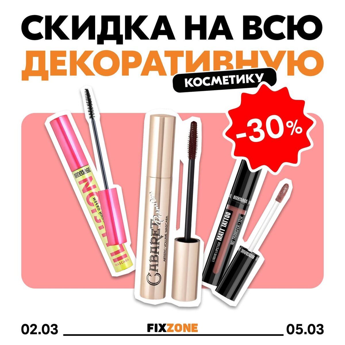 Солнце. 30% на красоту. Первый шаг к весеннему образу: обновить косметичку. С 2 по 5 марта во всех магазинах FixZone — Скидка 30% на всю декоративную косметику! В ассортименте: ✨ Помады, блески и карандаши для губ; ✨ Тени, подводки и карандаши для век; ✨ Тушь для ресниц; ✨ Карандаши и средства для бровей; ✨ Тональные кремы, консилеры и корректоры; ✨ Пудра, румяна, хайлайтеры. Создавайте идеальный образ 💫 (Или закупайте классные подарки на 8-е марта ❤️😉)