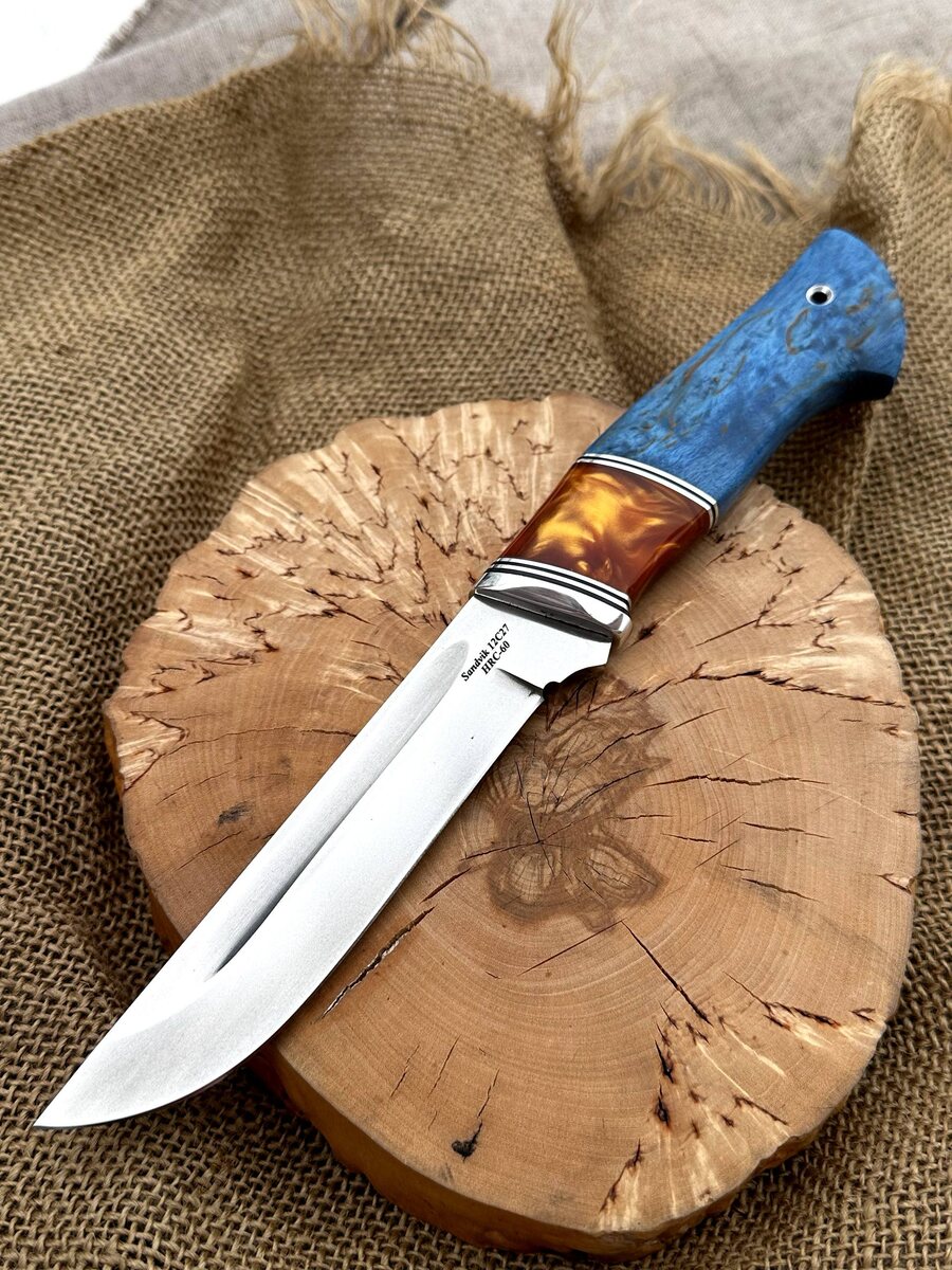 ! В наличии! 🔪 *Сталь Sandvik 12C27* (Швеция) — отличная коррозионная стойкость, высокая прочность и простота заточки. 📈 Спуски от середины клинка — *повышенная прочность* при боковых нагрузках. ⚡ *Бритвенная заточка* — рез всегда легкий и чистый. Рукоять: — *Акрил коричневый* и *стабилизированная карельская берёза* (синяя) — сочетание красоты и долговечности. — *Твердость клинка* — 60 HRC. Комплектация: — Кожаные ножны в комплекте. — *Возможность заказать формованные ножны* (+8 000₽). 💰 Цена: 11.650 ₽ 🔥 Акция: всего за 9.234 ₽! 📲 Заказывайте прямо сейчас: — Telegram: [@Nazarklinokbot](https://t.me/Nazarklinokbot) — WhatsApp: [+7 910 134-38-31](https://wa.me/79101343831) #кузницаназарова #ножручнойработы #sandvik12c27 #боевойнож #охотничийнож #подарокмужчине #ручнаяработа #стабилизированнаябереза #купитьнож