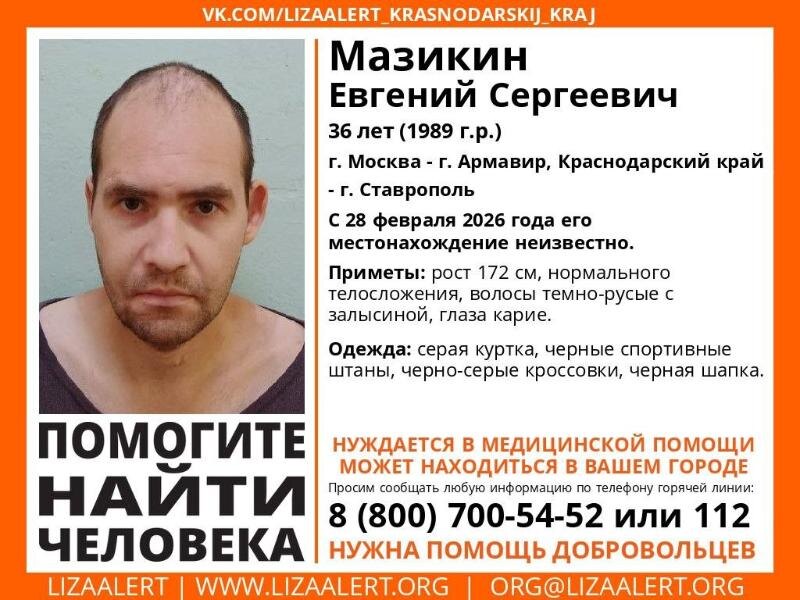 Волонтеры поискового отряда «ЛизаАлерт» сообщили о пропаже 36-летнего Мазикина Евгения Сергеевича. Мужчина может находиться на территории Ростовской области. По данным поисковиков, помимо Ростовской области Евгений может находиться в Москве, в Армавире (Краснодарский край) и Ставрополе. С 28 февраля 2026 года его местонахождение неизвестно. Приметы пропавшего: рост 172 см, нормального телосложения, волосы темно-русые с залысиной, глаза карие. Был одет в серую куртку, черные спортивные штаны, черно-серые кроссовки и черную шапку. Всех, кто располагает какой-либо информацией о возможном местонахождении мужчины, просят сообщить по телефону горячей линии поискового отряда: 8 800 700 5452 (звонок бесплатный). Григорий Мелихов Наш сайт в соцсетях: Telegram, Дзен, MAX.