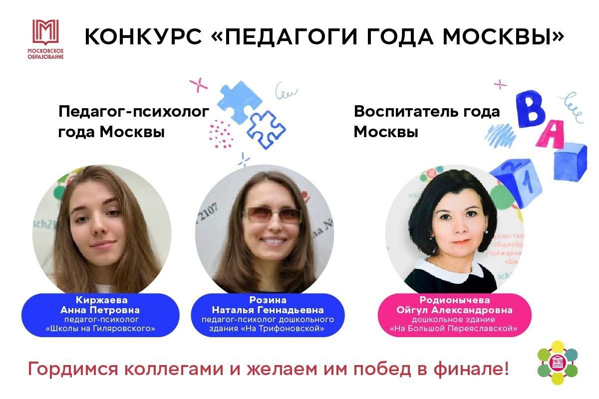 »! В номинации «Педагог-психолог года Москвы»: 🌿Киржаева Анна Петровна (педагог-психолог школы на улице Гиляровского). 🌿Розина Наталья Геннадьевна (педагог-психолог дошкольного здания на Трифоновской улице). В номинации «Воспитатель года Москвы»: 🌿Родионычева Ойгул Александровна (дошкольное здание на Большой Переяславской улице). Гордимся нашими талантливыми учителями, которые ежедневно дарят ученикам новые знания, вдохновляют на достижения и помогают преодолевать трудности. Желаем вам новых свершений и заслуженной победы в финале! Для нас вы победители уже сейчас!