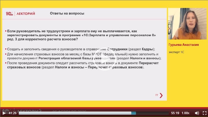 персоналом 8» ред. 3 для корректного расчета взносов? 🔻Ответ: Создать и заполнить сведения о руководителе в справочнике Сотрудники (раздел Кадры); Для начисления страховых взносов за месяц с базы МРОТ (федеральный) нужно заполнить и провести документ Регистрация облагаемой базы руководителя (раздел Налоги и взносы); После проведения документа следует рассчитать страховые взносы в документе Перерасчет страховых взносов (раздел Налоги и взносы – Перерасчет страховых взносов). на этот и другие вопросы ответила Гурьева Анастасия, эксперт 1С в лекции на тему Изменения в «зарплатном» законодательстве в 2026 году, поддержка в "1С:ЗУП", ред. 3 👉 Смотрите бесплатно полную видеозапись лекции 📲 1С:Лекторий в МАХ ❤ 1С:Лекторий в Телеграм 💙 1С:Лекторий Вконтакте