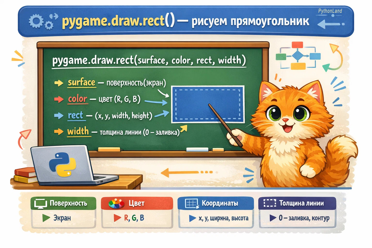 - рисуется прямоугольник с помощью pygame.draw.rect(),