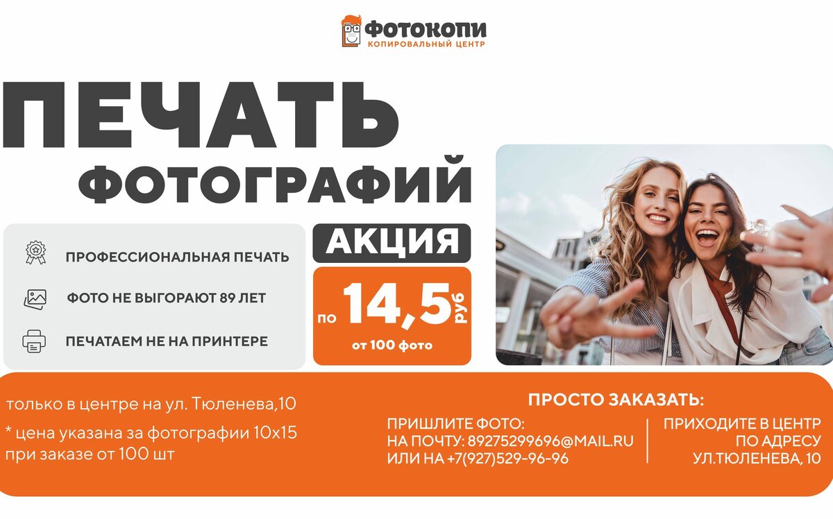 ! Мы печатаем на профессиональном оборудовании (не на струйном принтере!), чтобы ваши кадры оставались яркими десятилетиями. 🔥 АКЦИЯ: 14,5 ₽ за фото 10х15 (при заказе от 100 шт.) Как заказать быстро: ↪️Прислать фото на почту: 89275299696@mail.ru ↪️ Или в мессенджеры: +7(927)529-96-96 ↪️ Лично в центре: ул. Тюленева, 10 ⏳ Успейте распечатать свой архив по выгодной цене до 31.03.2026! Ставьте ❤️, если любите напечатанные фото