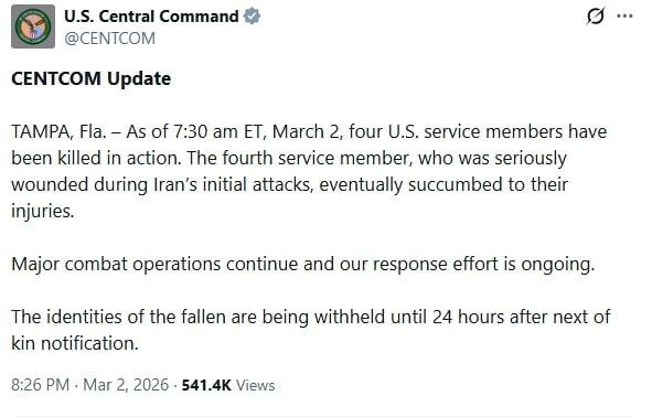 Центральное командование сообщает о гибели ещё одного американского военнослужащего в ходе операции против Ирана.
