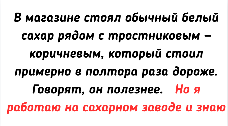 - В магазине стоял обычный белый сахар рядом с тростниковым — коричневым, который стоил примерно в полтора раза дороже. Говорят, он полезнее. Но я работаю на сахарном заводе и знаю, что тростниковый сахар всё равно привозят для переработки в белый. © Lss85